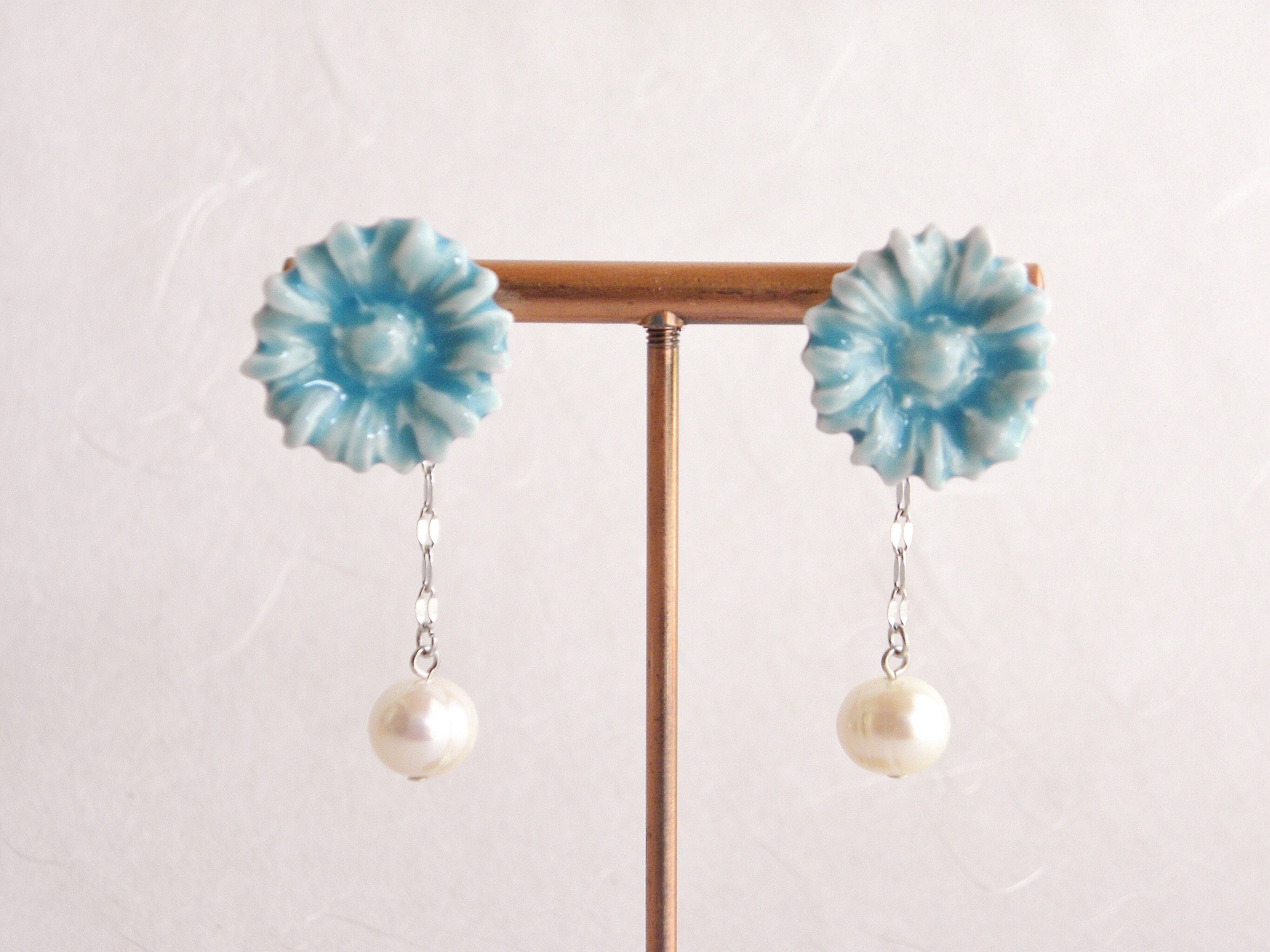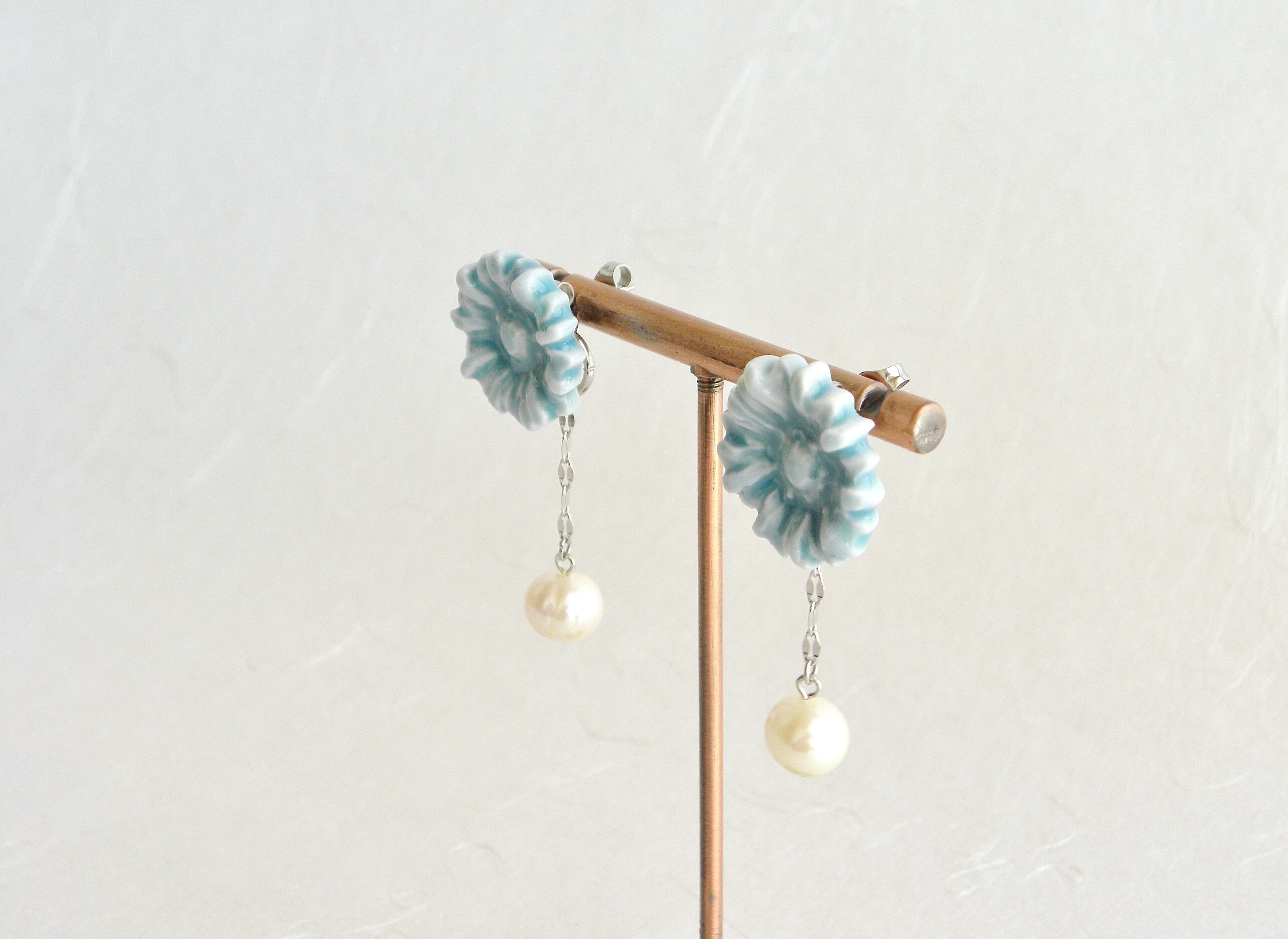 有田焼ステンレスピアス フラワー(水色)&淡水パールバックチャーム