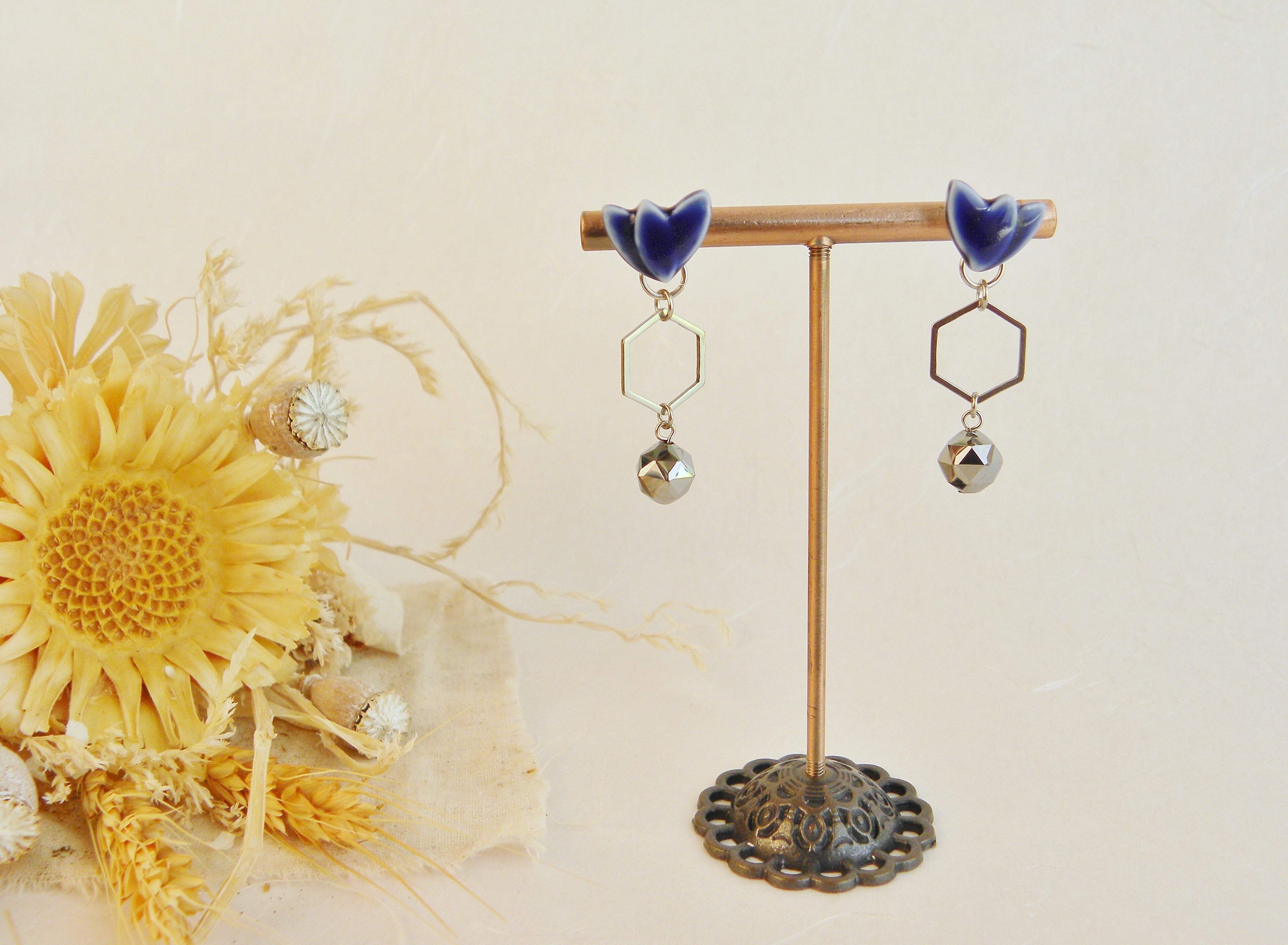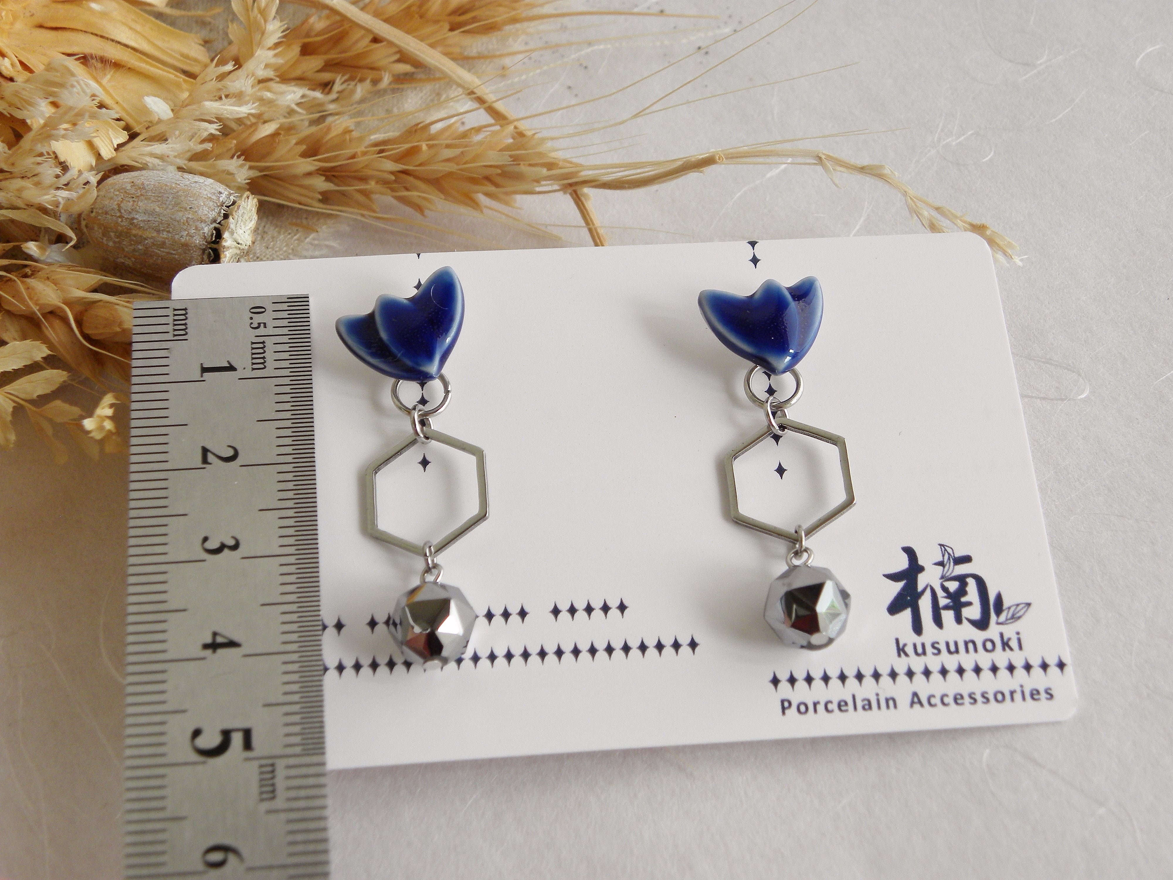 有田焼ステンレスピアス 三枚葉(瑠璃色)&テラヘルツバックチャーム